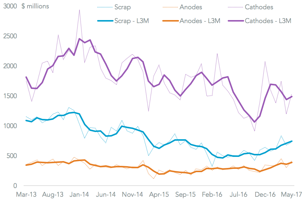The regulations are unlikely to cover pre-sorted copper scrap. By contrast to waste machinery imports of scrap have grown rapidly. In the 12 months to May 31 scrap copper imports were equivalent to 34.4% of “new” copper raw materials. Imports had increased 45.3% in the past quarter on a year earlier, compared to an 18.1% drop in copper cathode shipments. A prohibition on imports of presorted scrap would leave leading exporters including Ningbo Jintian Copper to compete for new materials and potentially facing higher costs as a result.