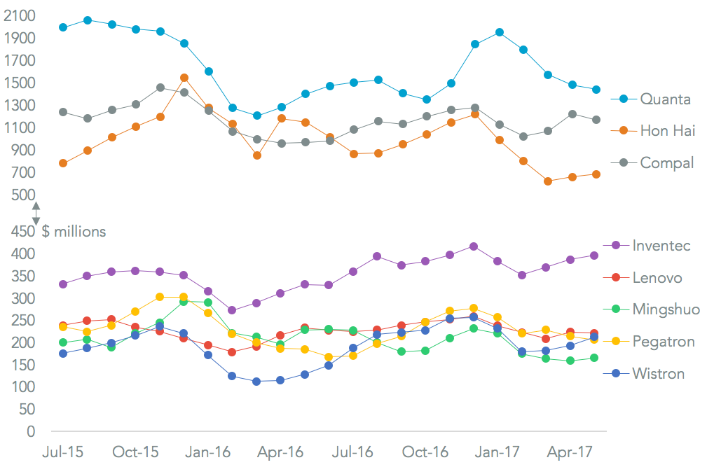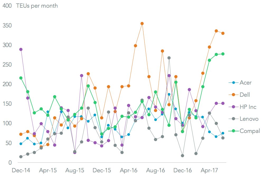Compal’s experience in its Chinese operations reflected the “U.S. best” trend too, with its global exports of laptops rising 20.6% in the three months to May 31 vs. the more-than-doubling seen in its U.S.-bound shipments. That still puts Compal well behind number one manufacturer Quanta, which grew by just 2.9% over the same period. The fastest growing manufacturer was Wistron, which is still only second tier but expanded exports by 65.7% in dollar terms.