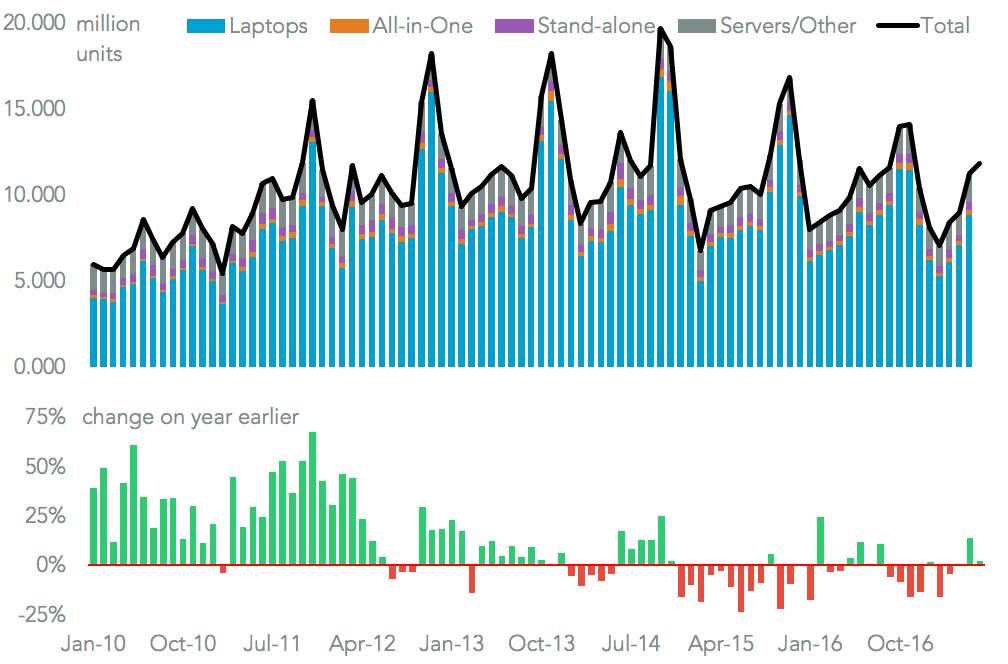 The pattern of improving shipments may be seen globally, at least for Chinese factories, suggesting the downturn seen by IDC may reverse. Total Chinese exports of PCs increased 9.2% on a year earlier in May, including an unusual spike in shipments of desktop machines (107%). Commercial-sector demand appears to be robust, with server shipments rising 19.2%. Laptops meanwhile rose just 3.7%, suggesting the U.S. was the only market seeing significant growth.