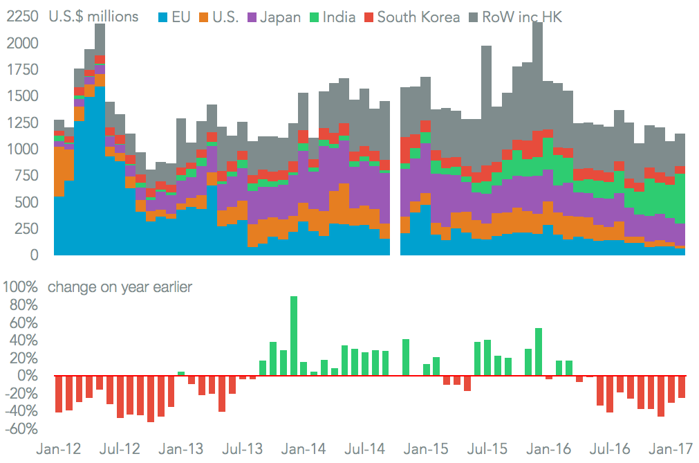 The challenge for producers located in China is that many other regions and countries have enacted tariffs against their equipment. The most recent example was Turkey. There has been significant growth in shipments to India, reaching 63.4% in February, though expansion back into the European Union and as a result of an Environmental Goods Agreement look a long way off.