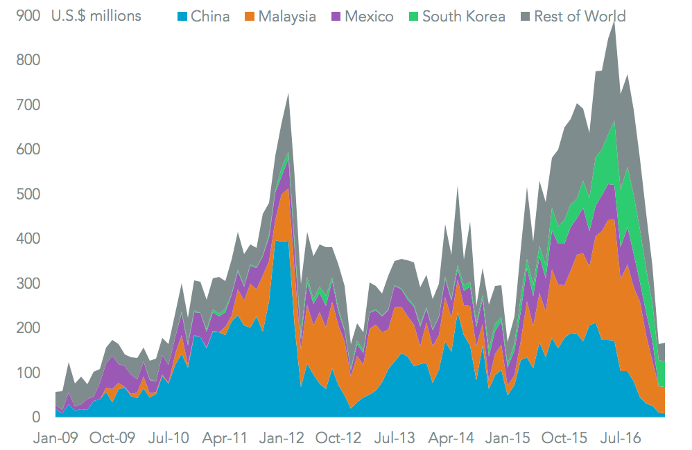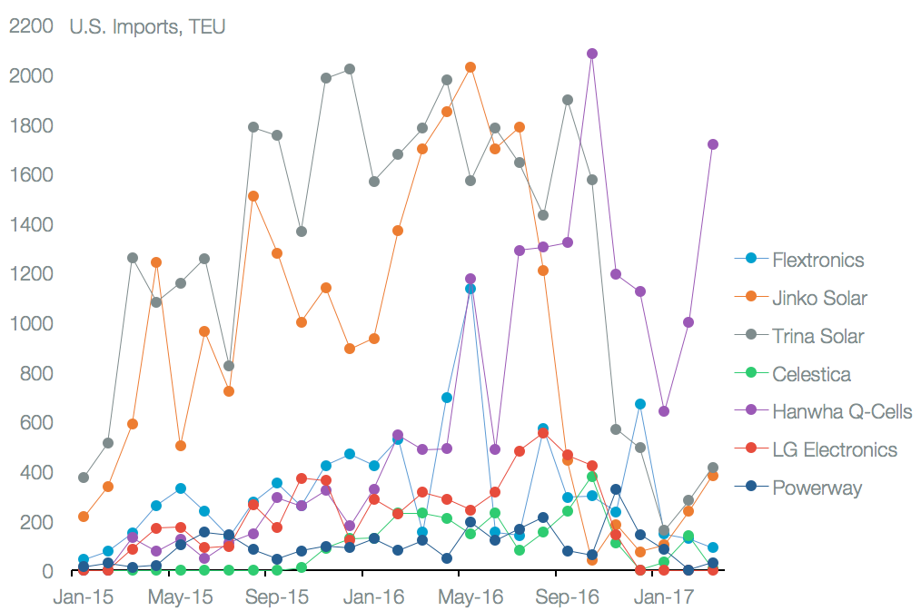 Imports of solar power equipment from China dropped to $8.4 million in February, their lowest since at least 2009. That was partly offset by higher imports from South Korea (11.7% higher in the three months to February 28) and Thailand (15.1% greater over the same period).