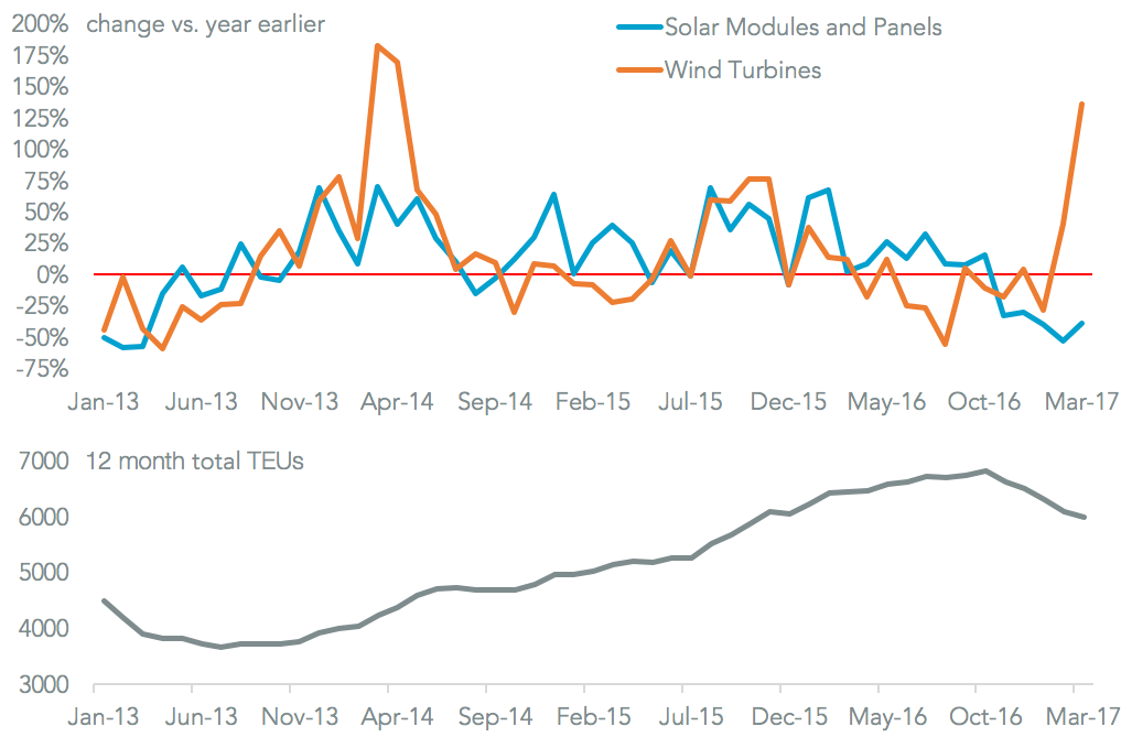 The roll-back of the Clean Power Plan after a recent Executive Order is more about removing pressure on coal than removing supports for renewables. In any event renewable energy projects that would stem from replacing older coal plants wouldn’t have arrived until after 2020. In the meantime support for large scale renewables, including wind, are driven by state-level renewable portfolio standards. Panjiva data shows that wind energy equipment imports reached their highest since at least 2007 in March. The largest importer was Vestas Wind Systems’ nacelle parts business. It accounted for 435 of installed capacity in the U.S. in 2016 according to AWEA data, ahead of domestic manufacturer General Electric.