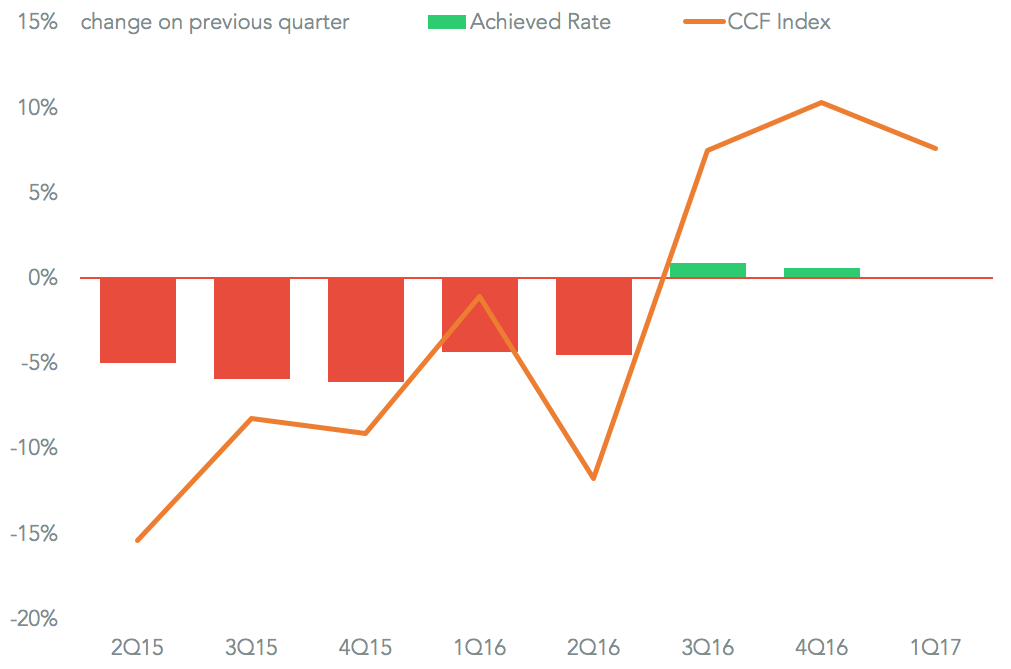 The company has indicated that it relies on long term contracts the repricing date for “the majority being April 1” on Asia-Europe rates and Transpacific routes being one to two months later than that. That process is confirmed by Hapag-Lloyd’s average achieved rates vs. market rates. Panjiva analysis of company financial statements and the Shanghai Shipping Exchange’s CCFI rate shows the effect of contracting mean the quarter-on-quarter movement on rates was less extreme than that in the market except for 1Q 2016. Yet a cumulative 25.3% rise in market rates in the past three quarters has only translated into a 1.5% rise in achieved rates. The seeds of a slowdown may have been sown already, however, as rates have fallen 11.4% since their mid-February peak.