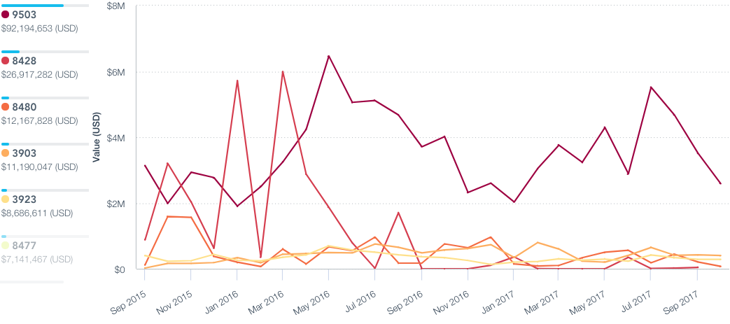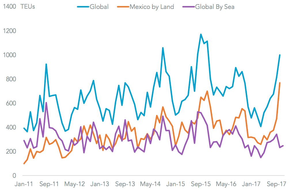 However, that has included a 38.4% surge in shipments from Mexico in October, while seaborne shipments rose 7.8% in November. That may reflect a late surge in interest following the “Lego Ninjago” movie release in September. The firm is far from out of the woods though as the June to October imports are 21.2% below 2015 levels (which coincided with the “Star Wars” franchise reboot) and 10.8% below 2014 (after the original “Lego Movie” was released).