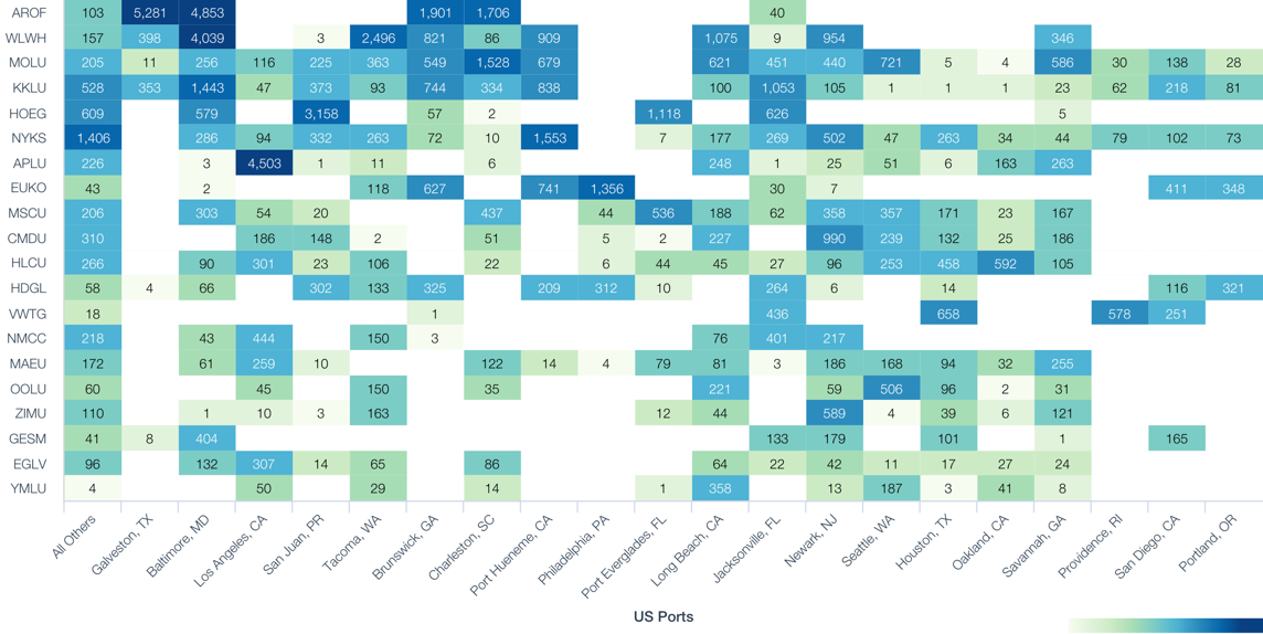 Further growth for Höegh would require entering fundamentally new markets – Baltimore and Jacksonville already account for 19.6% of its shipments. The biggest gaps in route coverage are on west-coast routes, though this would require competing with the Japanese shippers head-on, as well as CMA-CGM which leads on routes into Los Angeles.