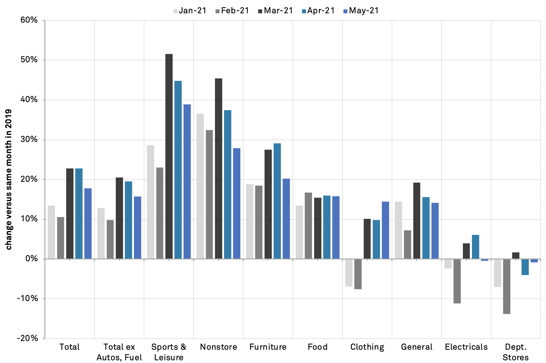 The latter included a 38.9% rise in sports / leisure goods sales as consumers prepared for a summer of outdoor activities while a 27.9% rise in non-store sales versus 2019 confirms the shift to e-commerce rather than in store.