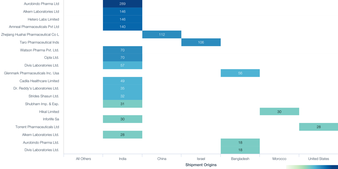 Chart segments U.S. seaborne imports of anticonvulsant drugs by shipper and country of origin for the past 12 months. Source: Panjiva