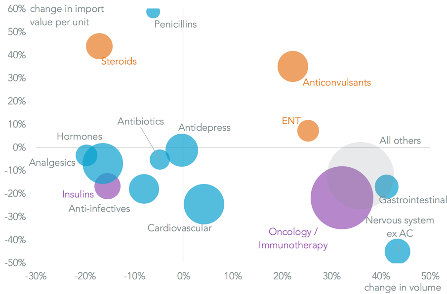 Chart segments U.S. imports of pharmaceuticals by product type (HS-6), with changes on a three month basis vs. a year earlier. Bubble size indicates total value of imports by classification. Source: Panjiva