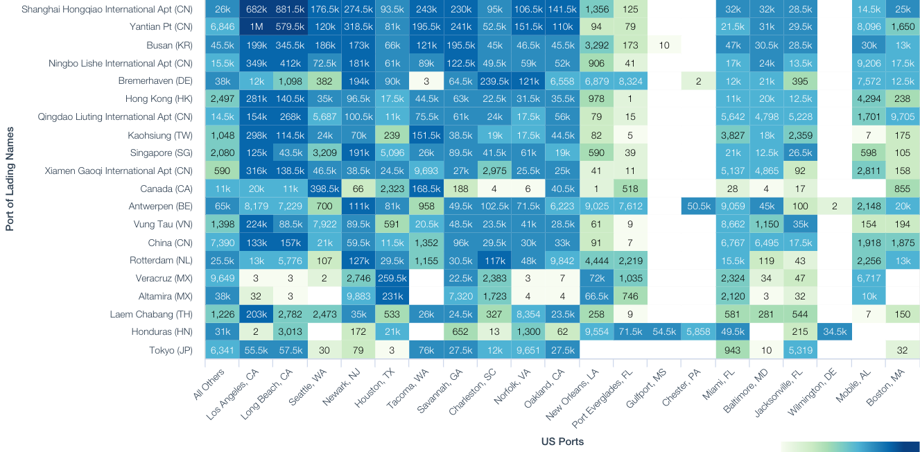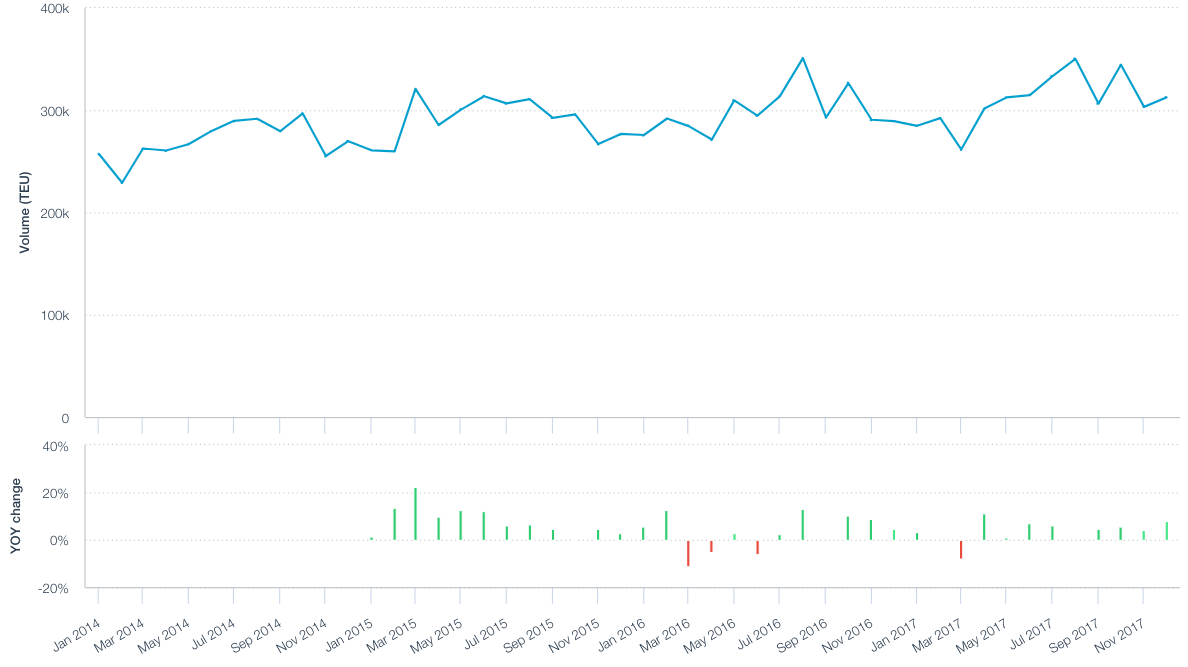 Taking 2017 as a whole the most import port-to-port pairs continued to be dominated by trans-Pacific trade with eight of the top 20 routes being based on China into Los Angeles or Long Beach. The largest port pairs outside California include Vancouver to SeaTac (398,701 TEUs), Shanghai to New York (274,265 TEUs), Veracruz to Houston (259,376 TEU) and Bremerhaven to Charleston (239,504 TEUs).