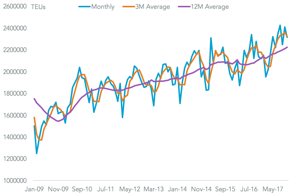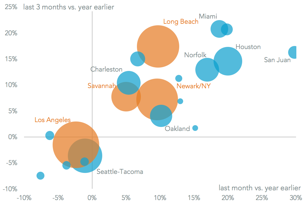 Charleston’s 17.0% rise in December suggests it is still benefiting from a superior share of traffic inbound from China via the Panama Canal vs. regional competitor Savannah which grew just 5.0%. On the negative side other continuing trends have been the underperformance of Seattle / Tacoma (1.1% lower) and a strong performance from Long Beach than LA (9.7% higher vs. 2.4% lower).