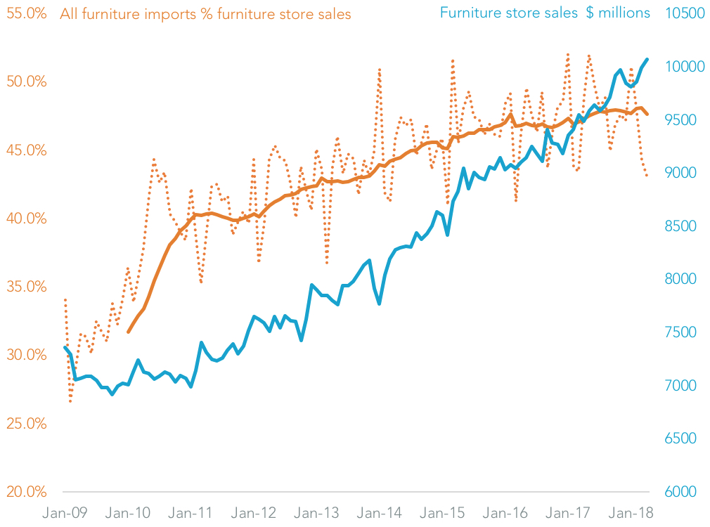 U.S. retail sales by the furniture industry set a new record of $10.0 billion (seasonally adjusted) in a single month in April after rising 6.1% on a year earlier, Panjiva analysis of official figures shows. The share of imported furniture in that growth has begun to fall, however, with imports equivalent to 44.3% of sales in March from a peak of 51.1% in January – Panjiva data shows – and seaborne shipments down 6.5% on a year earlier in April.