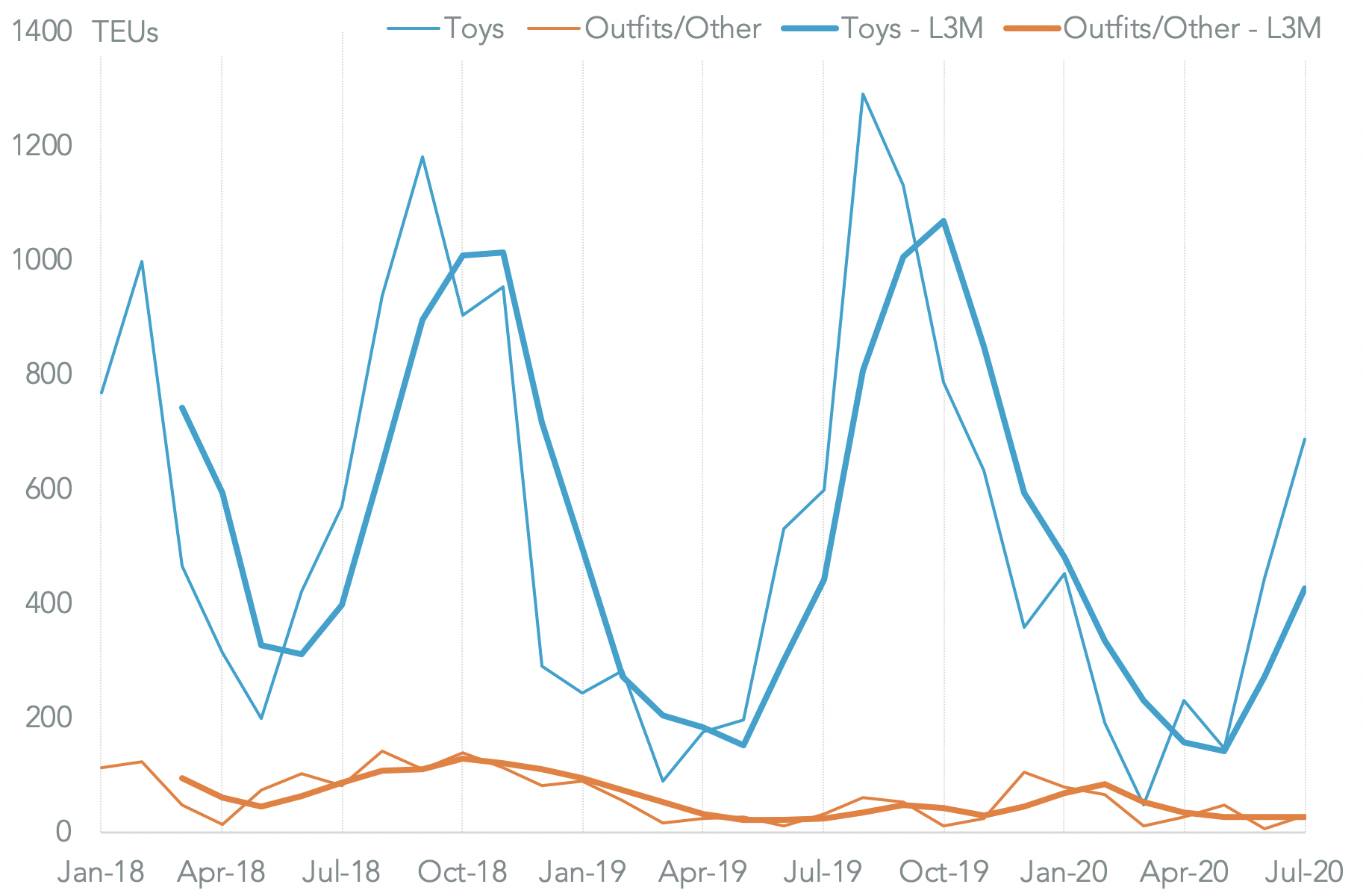 Panjiva’s data shows that U.S. seaborne imports linked to the firm, which normally peak in September, dropped by 6.7% year over year in Q2. There has nonetheless been a 13.8% expansion in the first three weeks of July including a 14.8% rise in shipments of toys, as opposed to costumes, suggesting that the underlying business is proving robust despite weak seasonal orders.
