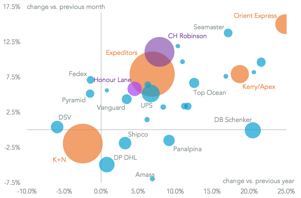 The Asia-centric nature of the improvement likely explains the outperformance of regional specialists. Orient Express saw the fastest growth among the top 20 shippers with a 24.8% increase in volumes vs. a year earlier, while Kerry’s Apex climbed 20.5%. By contrast the European specialists saw a slowdown including a 2.5% drop from Blue Anchor (K+N) and a 5.9% drop from DSV. The latter may be looking to preserve its margins after a solid fourth quarter performance. DB Schenker was the most aggressive of the European shippers with a 20.5% rise.