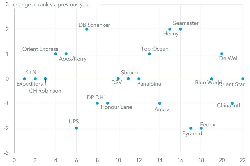 The aggressive bid for market share from Orient Express and Apex / Kerry meant both climbed up the rankings of operators to fourth and fifth respectively overtaking UPS (sixth from fourth a year earlier). Meanwhile DB Schenker outstripped both DP DHL and Honour Lane.