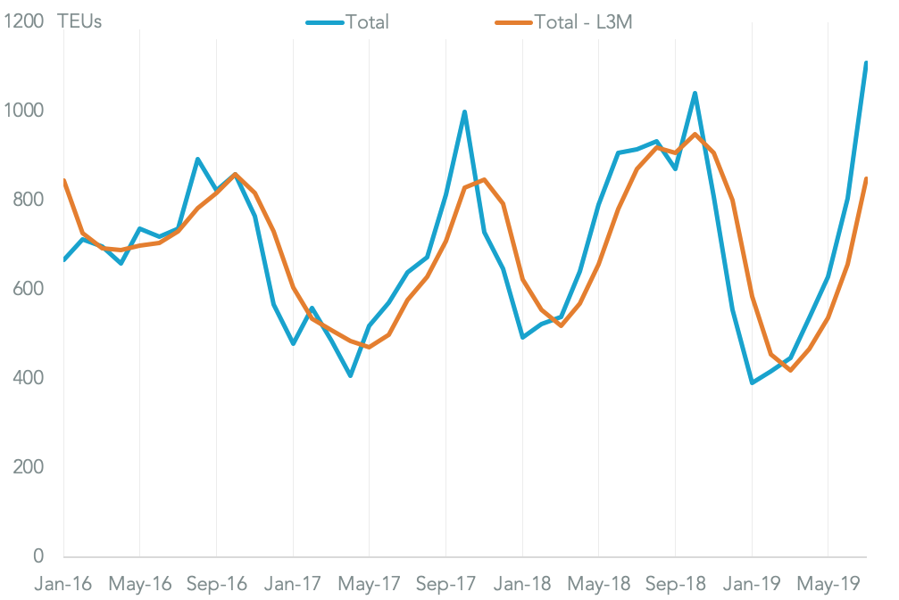 Activity in the U.S. market may have been particularly slow. Panjiva data shows imports associated with the company and its products to the U.S. by sea and by land from Mexico fell by 15.8% in 2Q. That followed a 19.2% contraction in 1Q which started to reverse a 19.9% surge in 2018. Yet, a 21.2% jump in July suggests there may be a turnaround on the way already.