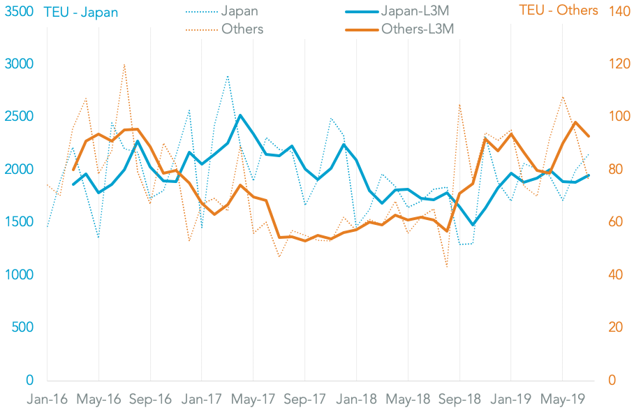 U.S. seaborne imports returned to growth in July with 1.5% increase year over year after a 2.5% decline in June. Imports from China continued to slide with a 3.0% reduction compared to a 3.3% fall in 2Q. That was offset by an increase in shipments from Asia ex-China which climbed 11.5% as companies switched sourcing to Vietnam – imports from which rose 28.5% to a record number of shipments – as well as India and Thailand where imports climbed 17.6% and 16.0% respectively.