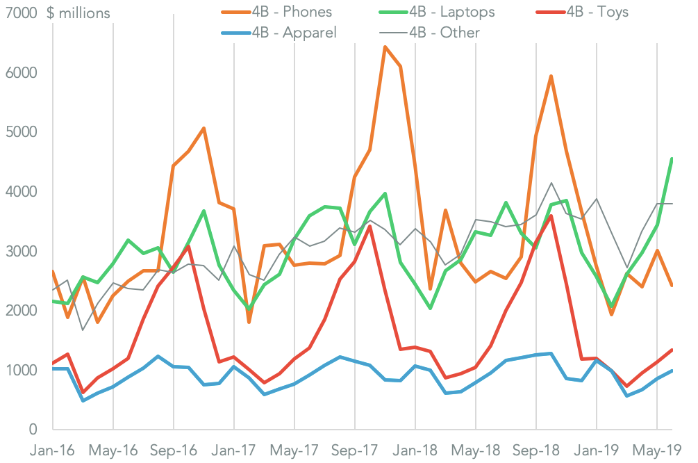 Chart segments U.S. imports from China covered by list 4B tariffs according to product group.  Source: Panjiva