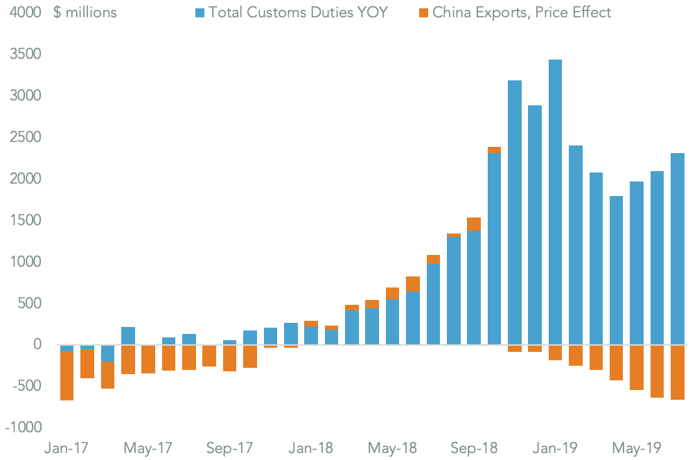 Chart compares dollar value of change in U.S. import prices from China to change in U.S. customs duty income on a year over year basis. Calculations based on U.S. Bureau of Labor Statistics and Treasury Department figures.  Source: Panjiva