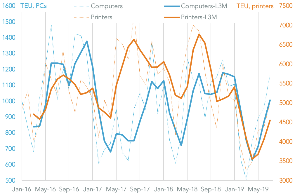 The bulk of electronics imports that have yet to be covered by tariffs are in list 4B, though list 4A imports of televisions and audio equipment – potentially including those by Best Buy and TCL – were worth $8.7 billion and including. Similarly shipments of printers and desktop computers – which fell 14.3% and 32.7% year over year in 2Q – are also included with importers likely including Konica Minolta and Samsung Electronics.