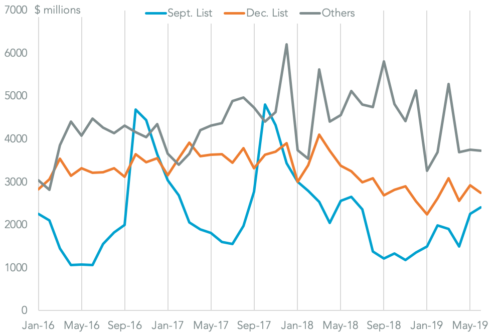 The Trump administration has modestly de-escalated the trade war by splitting the so-called “list 4” tariff group – where duties of 10% were due from Sept. 1 – into two parts. The minority part, worth $108.8 billion in terms of imports in the 12 months to Jun. 30 and known as list 4A will have duties of 10% applied from Sept. 1.