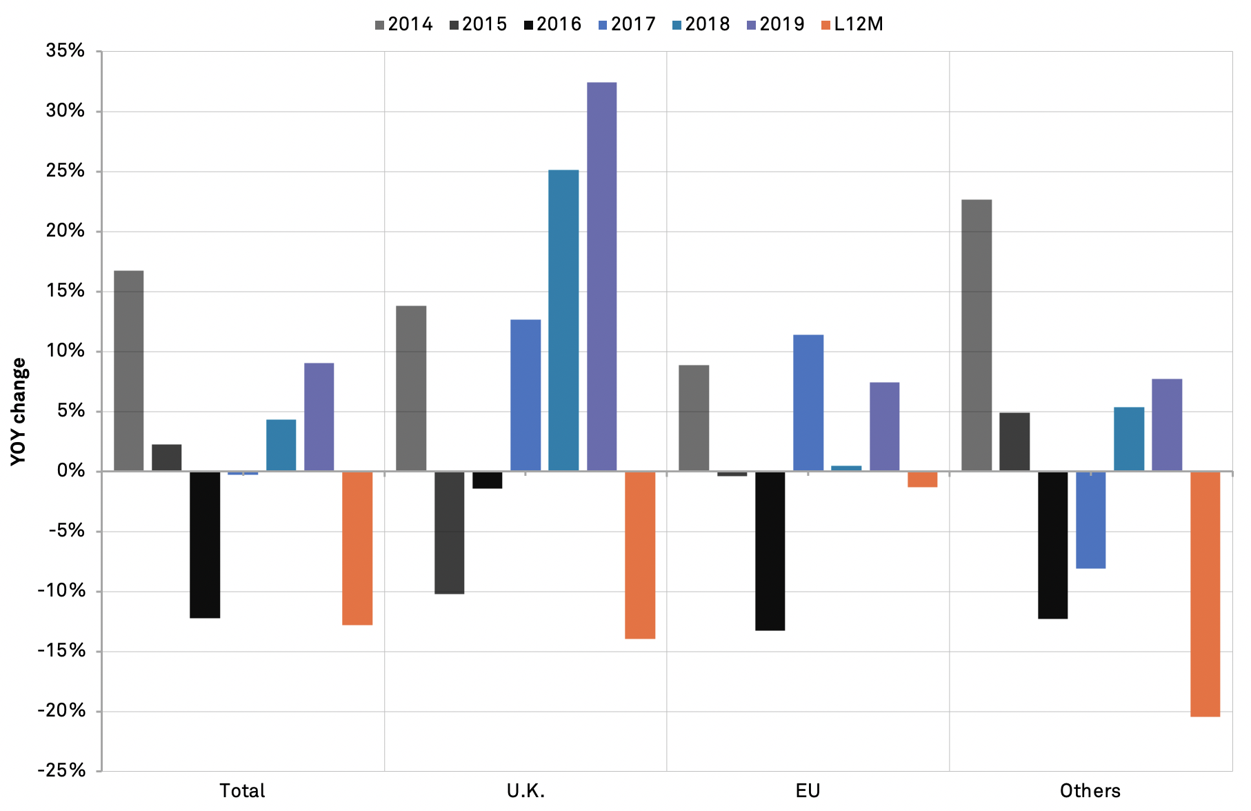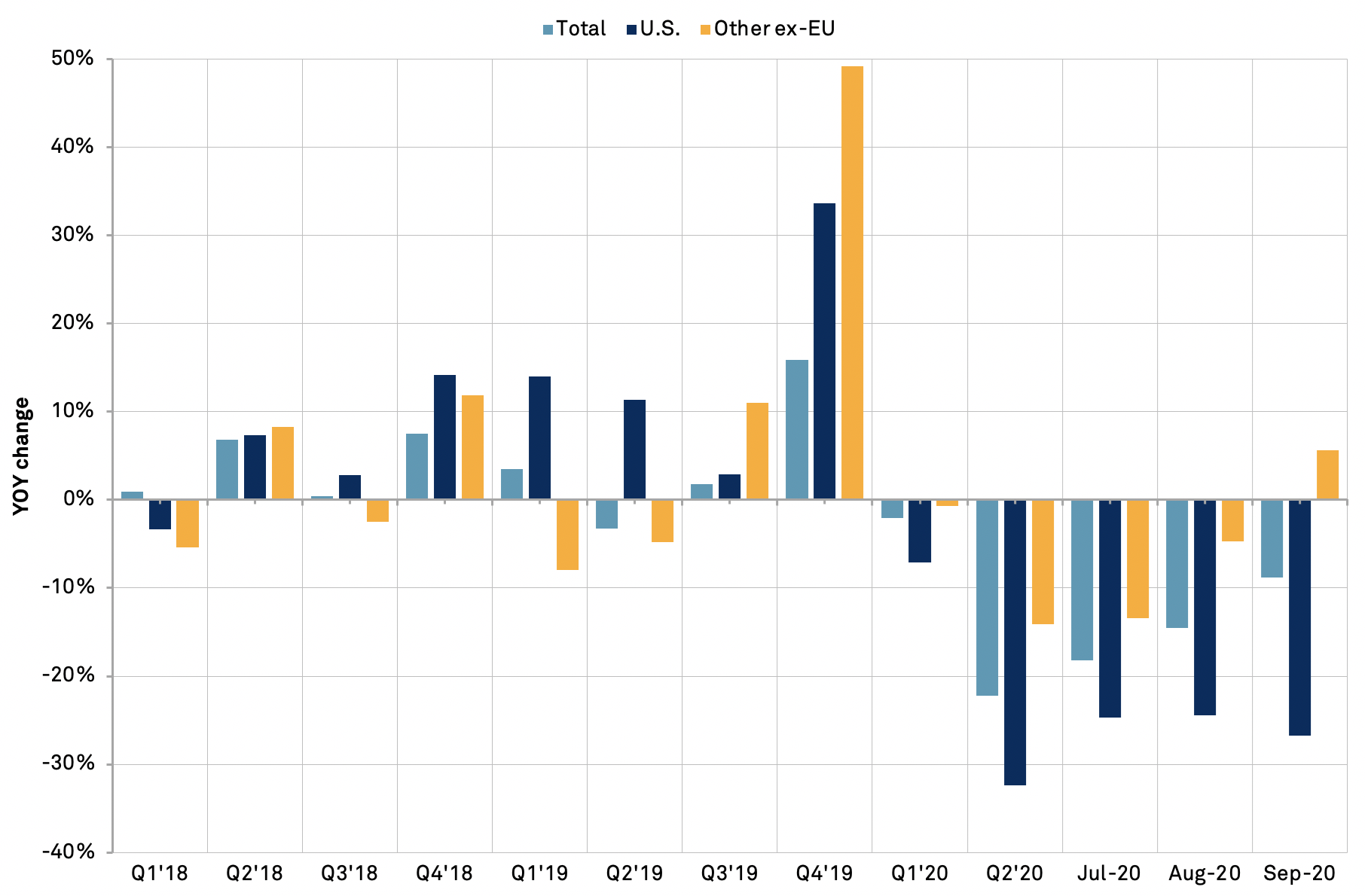 U.K. exports to the U.S. have slowed in Q3’20 having previously led the expansion. In 2019, exports to the U.S. increased by 18.2% year over year, Panjiva’s analysis of official data shows, while total exports increased by just 6.3%. By September 2020 there was a 26.8% slide in exports whereas total U.K. exports dipped by 8.8%.