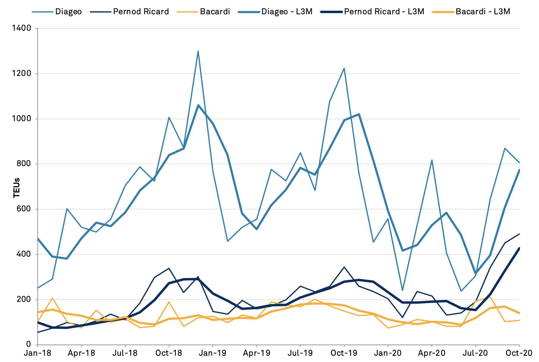 Panjiva’s U.S. seaborne import data shows that downturn has likely continued recently with total shipments down by 16.6% in October after a 16.1% slide in Q3. Diageo and Bacardi have done worse than average with declines of 34.0% and 27.5% respectively in October while shipments linked to Pernod Ricard have surged 42.3% on improved sales of its Glenlivet brand.