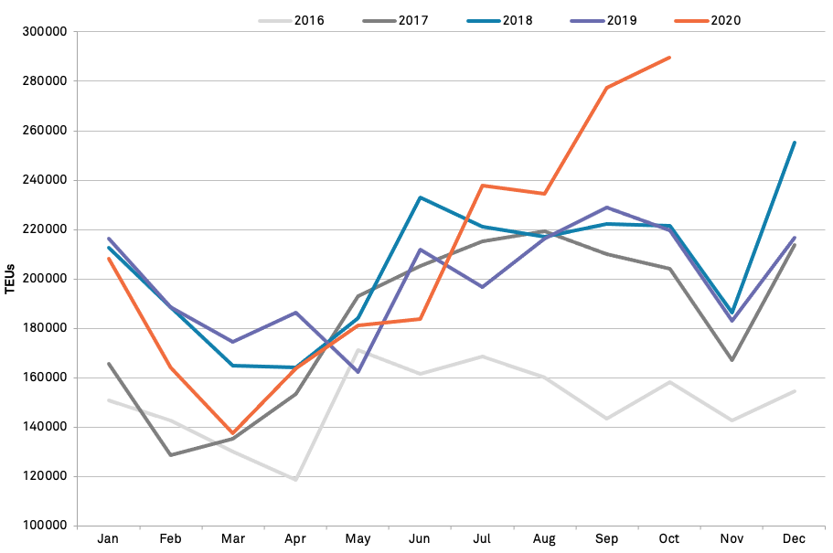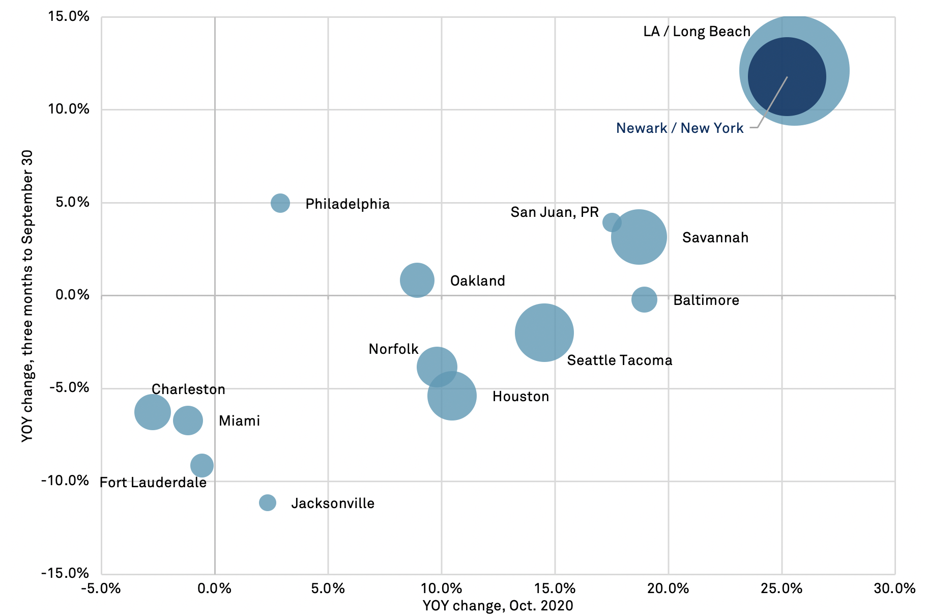 The worst performing port was New Orleans with a 23.5% drop in October following a 26.4% drop in Q3’20. That’s likely been due to closures and regional economic disruptions caused by the record hurricane season. Heavy weather may also have taken a toll on the performance of Charleston and Miami which declined by 2.7% and 1.2% respectively in October.