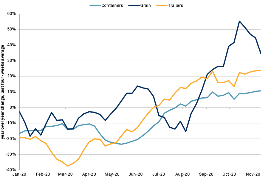 The surge in volumes across the west coast into and out of the rest of the U.S. can also be seen in traffic handled by railroad operator Union Pacific. Panjiva’s analysis of STB data shows Union Pacific’s handling of multimodal capacity has climbed steadily with container carloads up by 10.8% and trailers having surged 23.7% higher than a year earlier in the four weeks to Nov. 11.