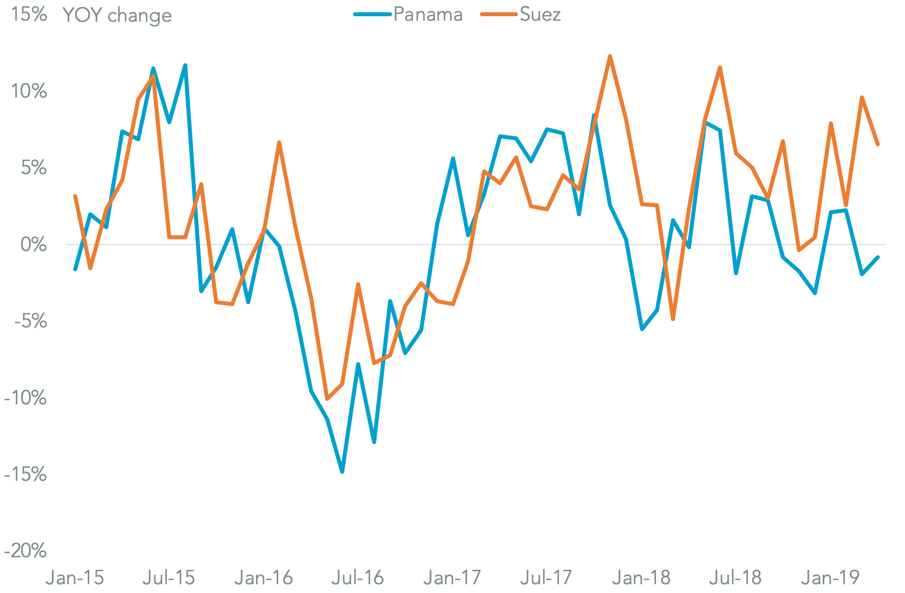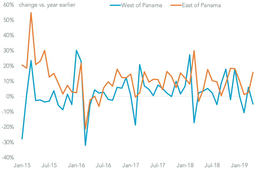 Both Canals will face a challenge from the worsening U.S.-China trade war, discussed in Panjiva’s research of May 16. Competition for traffic to the U.S. east coast will be particularly fierce. Growth in volumes from eight Asian countries to the U.S. east coast have outperformed those to the west coast in five of the past six months, Panjiva data shows, with a 15.9% surge in April compared to a 4.9% slide in shipments to the west coast.