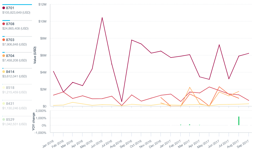 So far Mahindra’s activity in the U.S. has been focussed on agricultural vehicles. Panjiva data shows 79.9% of its $75.0 million of exports to the U.S. related to tractors and spares in first three quarters of this year. What isn’t yet known is the extent to which Mahindra will use locally-sourced parts, or utilize exports from its Indian operations.