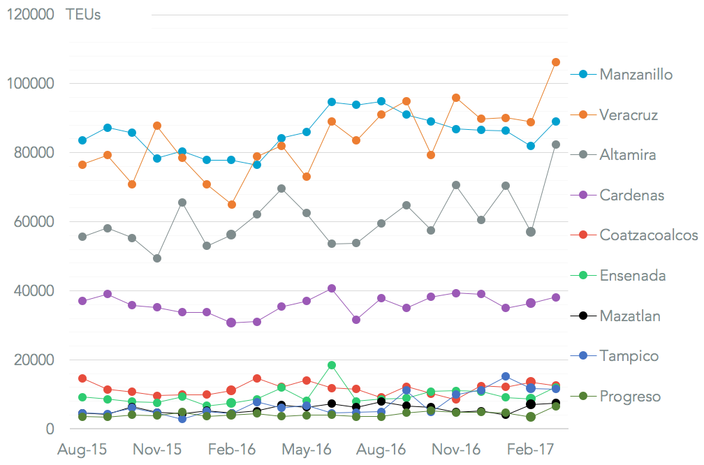 Among the other major ports Altamira saw a 32.8% increase in handling to reach a new high of 82,420 TEU equivalent. That was the result of a significant step-up in imports of steel pipeline tubing from Mitsui in Japan. That may relate to investment projects in the energy sector, including those by TransCanada, that may bring U.S. shale gas to Mexico.