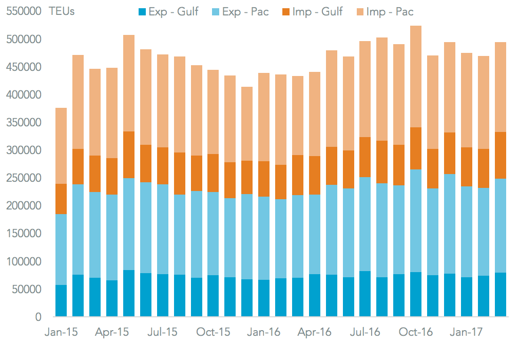 The gulf coast ports, led by Veracruz, expanded exports the fastest with a 27.0% increase. That was the sixth straight month that the gulf coast outperformed the Pacific coast.