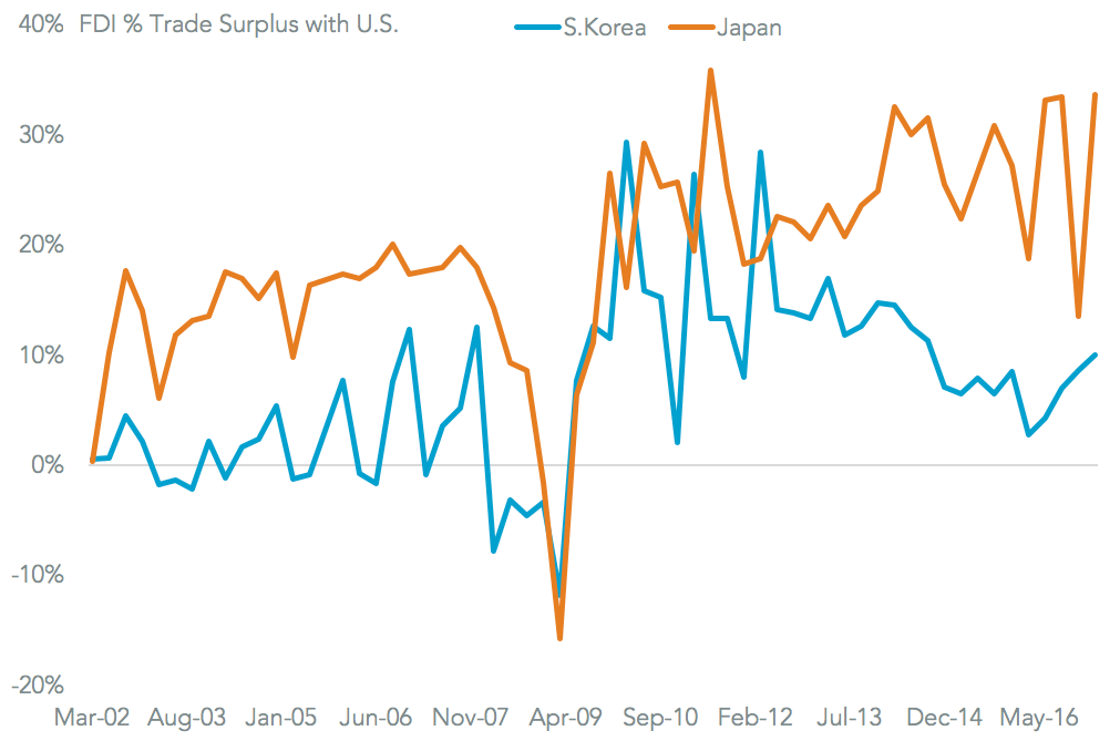 Chart compares foreign direct investment to trade surplus with the U.S. (using U.S. import and export data) on a quarterly basis. Calculations include BEA data for FDI. Source: Panjiva