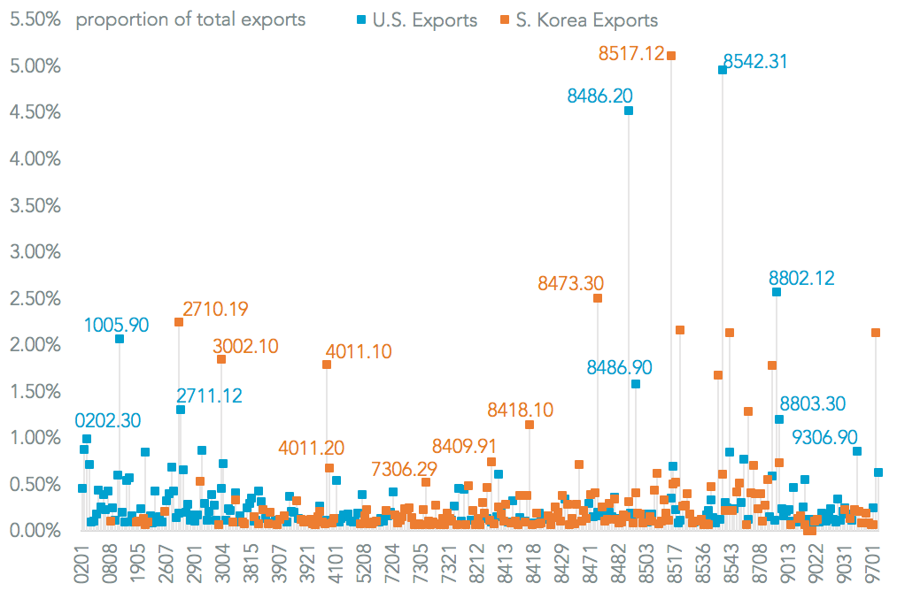 Chart shows top 200 export lines for U.S. and South Korea to each other, segmented by HS code. South Korean exports for 8703.23 (15.6%) and 8703.24 (5.13%) and U.S. export 8800 (8.29%) excluded for clarity. Source: Panjiva