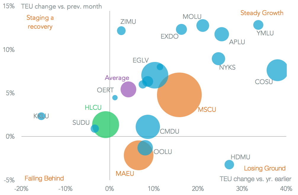 Container-lines operating on U.S.-inbound routes had a strong performance as a group in July, with a 4.2% increase in containers handled, Panjiva data shows. Growth was principally driven by shipments from China and Asia (particularly Vietnam), as outlined in Panjiva research of August 7, as reflected in the stronger-than-average performance of the Asian shippers.