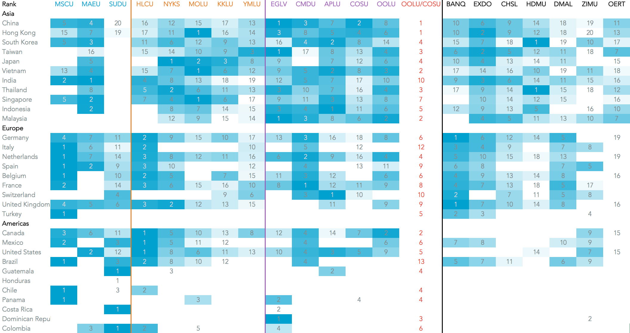 That process is by no means guaranteed of course. Of particular concern are regulatory approvals for COSCO Shipping’s bid for Orient Overseas. Panjiva analysis of nearly 4,400 carrier-country pairs shows the new entity will be a top 3 shipper on at least eight U.S. inbound lanes vs. four for the two separately. That includes China, Hong Kong, Vietnam, Malaysia and Canada.
