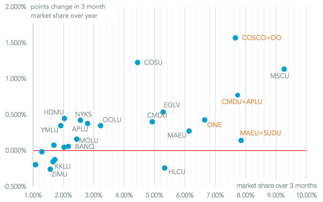 The only significant loser during the month was Hapag-Lloyd, which saw its volumes drop 0.9%, and its market share for the past three months fall by 0.24% points compared to a year earlier to reach 5.57% (5.82% including). That may reflect challenges it is facing while completing its merger with UASC. If it does, then the other shippers going through mergers or acquisitions – ONE, Maersk and COSCO Shipping – may see problems at a later stage.