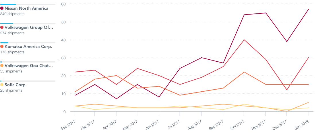 The major consignees in the region are led by the automotive industry including Nissan and Volkswagen so K+N’s choice of industry is unsurprising. Yet, that reliance may prove to be a drawback. As outlined in Panjiva research of January 30 the automotive industry faces significant supply chain upheaval risks from NAFTA negotiation. Specifically, rules-of-origin changes may make overseas parts manufacturing less economic, potentially cutting demand for freight services.