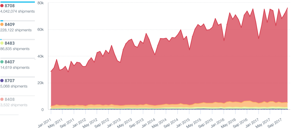 The automakers do not appear to be overly concerned about a proposed increase in the content requirements to 85% from 62.5% in the rules of origin in the aggregate yet. Seaborne imports of auto parts from outside NAFTA ranging from powertrains to interiors and semi-completed systems, climbed 3.1% vs. a year earlier in the fourth quarter and by 3.7% sequentially, Panjiva data shows. That would indicate little sign of stockpiling in the short-term. The reason may be an expectation that (a) NAFTA changes would take time to implement and / or (b) the bigger upheaval will be on intra-NAFTA supply chains.