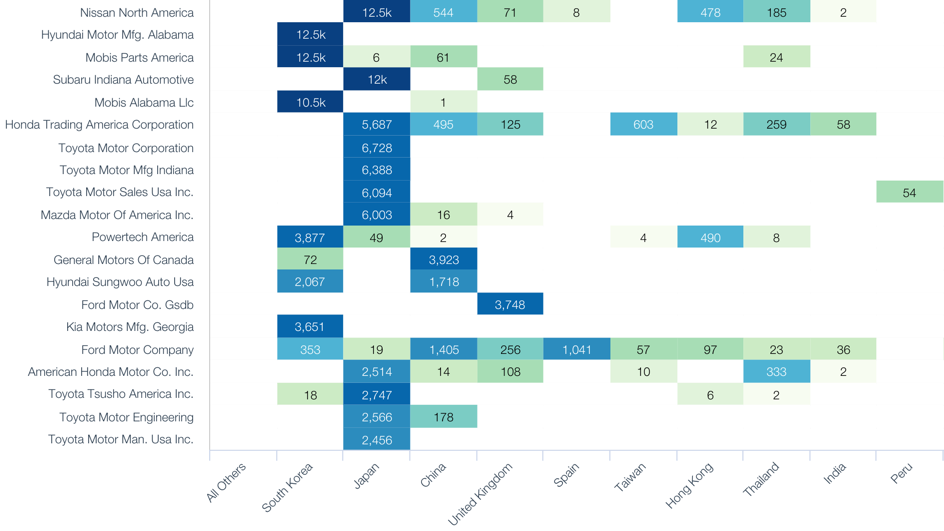The largest direct importer of parts from outside NAFTA for assembly into vehicles into the U.S. in the past 12 months was Hyundai (35,500 TEUs) followed by Nissan (13,600) and Subaru (12,000 TEUs). The former ships wholly from South Korea while the latter two ship mostly from Japan. As such they will need to decide whether to bring parts manufacturing into the NAFTA region.