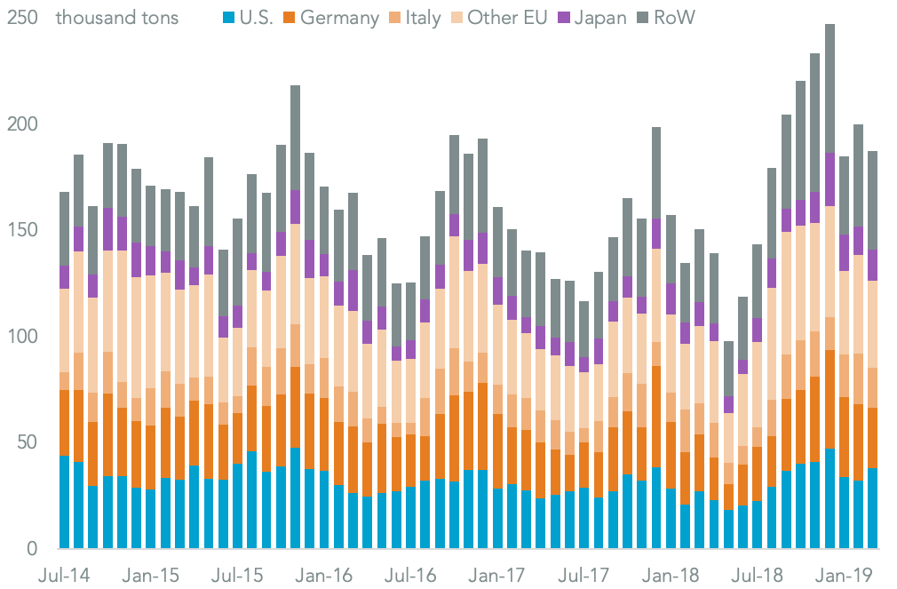 Exports from Mexico are also heavily reliant on the U.S., which represented 49.6% of the $719 million of exports in the 12 months to Apr. 30. American customers have been prioritized during the downturn in exports with a slip of 6.7% year over year in the three months to Apr. 30 compared to a 37.7% drop in shipments to other markets.