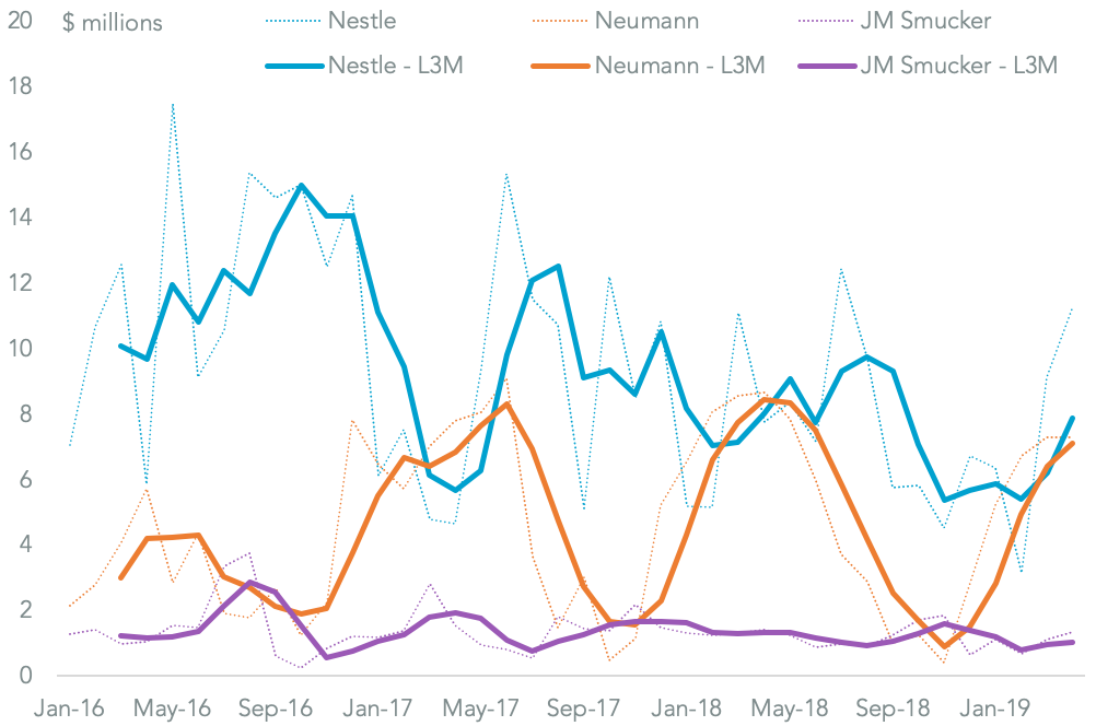 The largest exporter from Mexico in the 12 months to Apr. 30 was Nestle, representing 12.6% of total exports with a decline of just 1.7% year over year in the past three months. Nestle shipped 54.4% of its exports to the U.S. Its supply chain decision could have a profound impact on the Mexican export market.