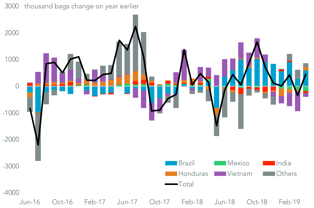 Global coffee exports saw an accelerated rate of growth in April with a 4.4% increase year over year in April compared to 0.3% in 1Q, Panjiva analysis of ICO data shows. That’s been led by a 25.1% surge in shipments from Brazil, continuing a pattern seen in 1Q of a 22.1% improvements. That’s more than offset a 48.0% slump in shipments from Mexico, which continued a decline of 40.3% in 1Q.