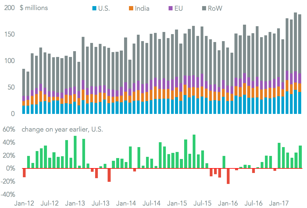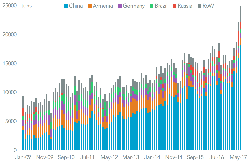 Chinese exporters are making the most of the slow progress on the case. Panjiva data shows that U.S. imports hit a new high in June, having climbed 25.8% in the second quarter. That was predominantly the result of higher shipments from China, which climbed 28.8% and account for 71.9% of the total, though shipments from Armenia also climbed to 2.6x their prior year level. Average prices have also increased, so the dollar value of total exports to the U.S. increased by 29.9%.