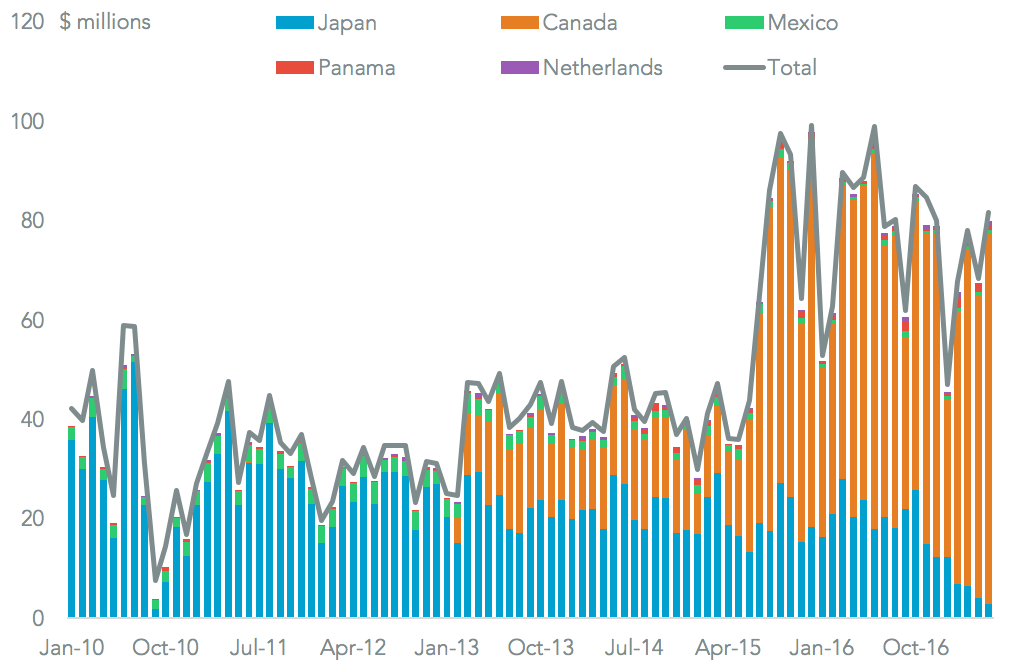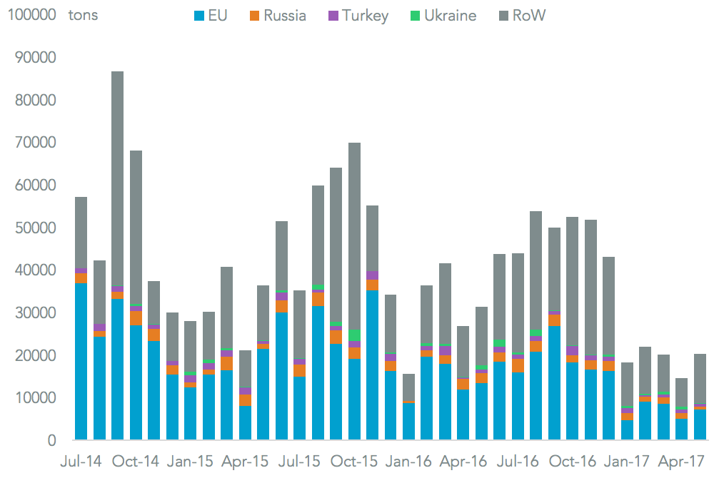 The U.S. FDA has released a multi-year roadmap to reduce the levels of nicotine in cigarettes to “non-addictive” levels. Stock prices for the tobacco-products manufacturers including Altria and BAT fell by as much as 10% in response. A weaker domestic market may drive U.S.-based producers to try and export more. Yet, U.S. trade in tobacco has declined slightly to $4.19 billion in the 12 months to May 31 from its peak of $4.3 billion of combined imports and exports in calendar 2016, Panjiva data shows.