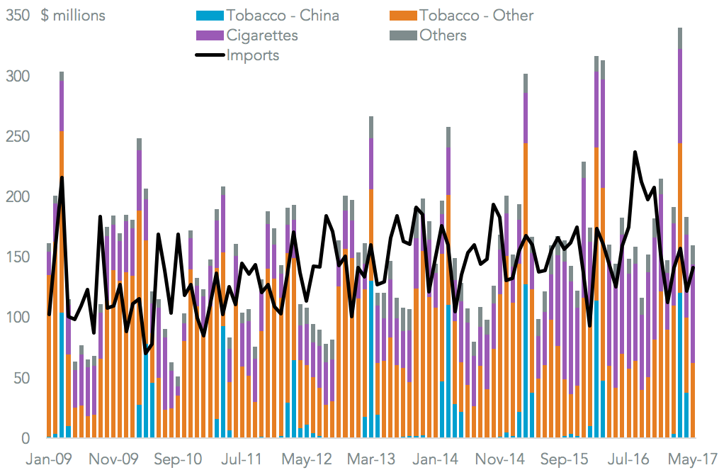 Export growth has maintained a steady growth rate, reaching 10.6% in the quarter to May 31, while imports dropped 2.2% over the same period. Within exports shipments of raw tobacco jumped 31.6% while cigarettes fell 8.0%. Growth in the former is somewhat overstated by later-than-usual deliveries of tobacco to China in 2017 vs. 2016.