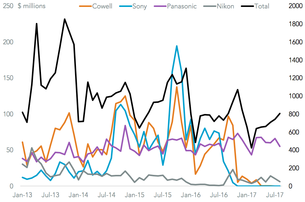 The Chinese camera industry more broadly has seen a similar problem. Exports of cameras fell by 43.2% over the same period, with shippers including Sony and Cowell having exited the market. A few have expanded however, led by Panasonic which actually increased shipments by 48.0%.