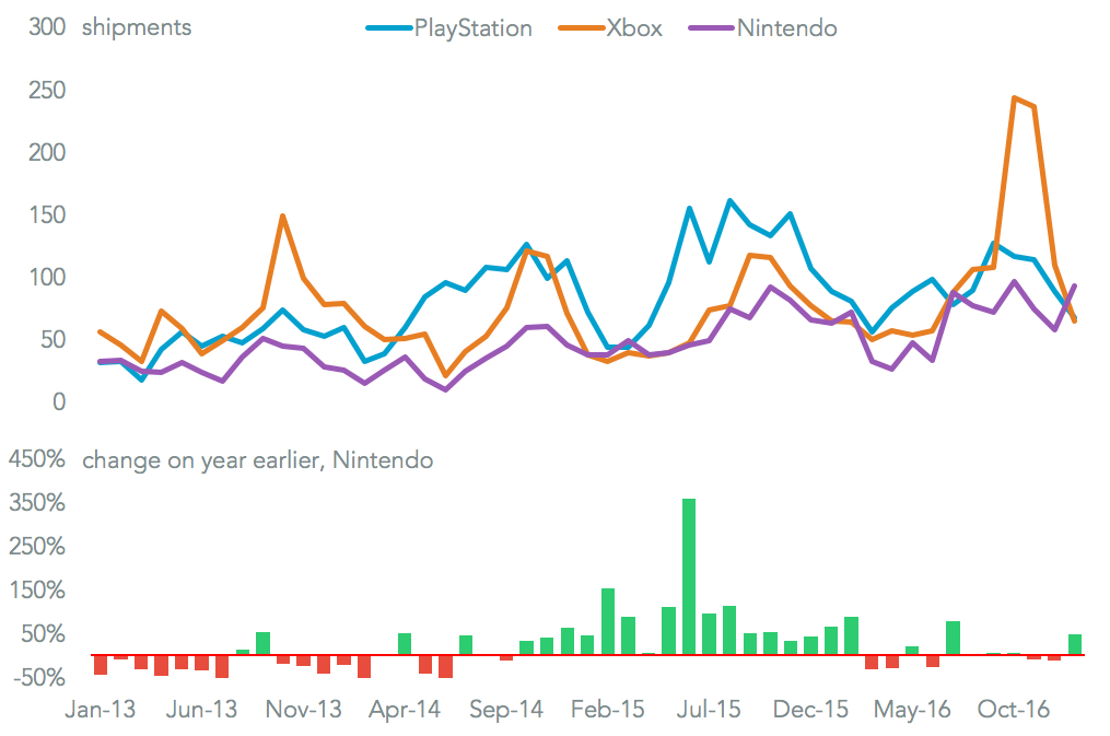 The likely driver of this is shipments of the new Nintendo Switch console, which is due to be released March 3. That has led imports of Nintendo products 47.6% higher on a year earlier in January after a 12.1% growth in December. The latter came despite the highly popular NES Classic Mini, and was reflected in a 21% revenue decline in the fourth quarter according to Bloomberg.