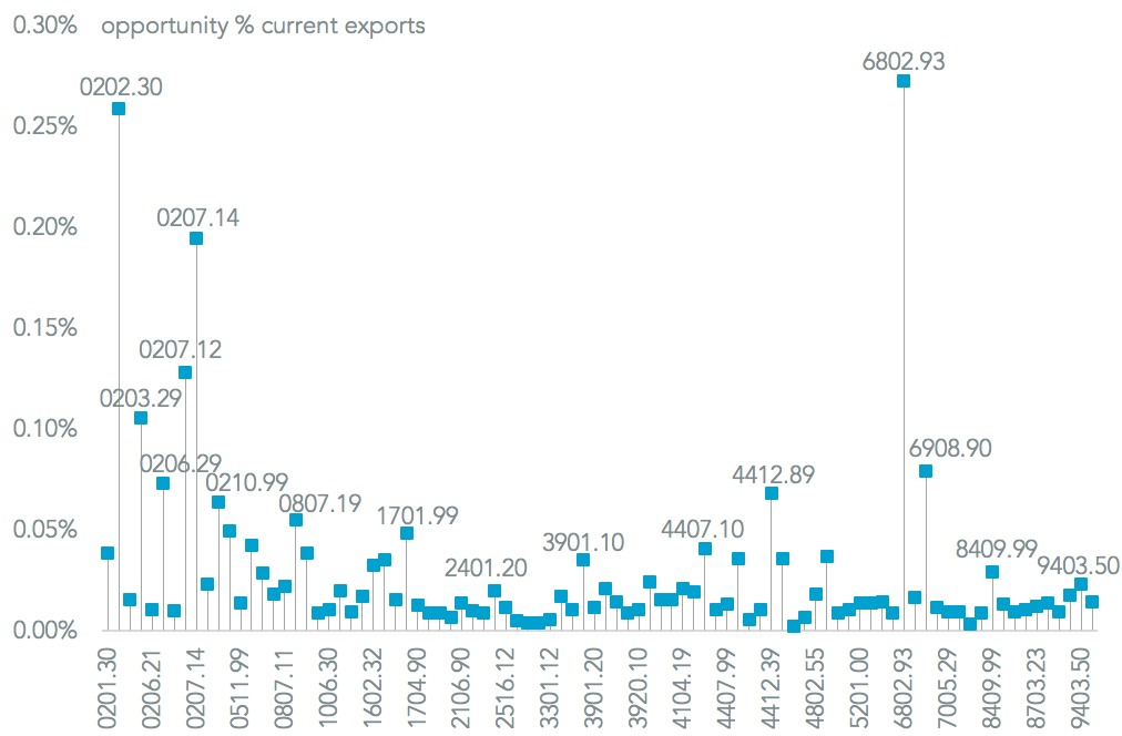 New trade deals, either bilaterally or as part of Mercosur negotiations, will presumably look to boost exports of ‘under-represented’ products. If each product moved up to Brazil’s average proportionally, without any drops in existing supplies, (eg more agricultural products to India without a loss of building material supplies) there could at least be a 2.6% increase in Brazil’s global exports of its top 100 product lines. The most relevant growth opportunities lie in growth of agriculture (especially meat outside of poultry), building materials (including stonework and ceramics) and wood products.