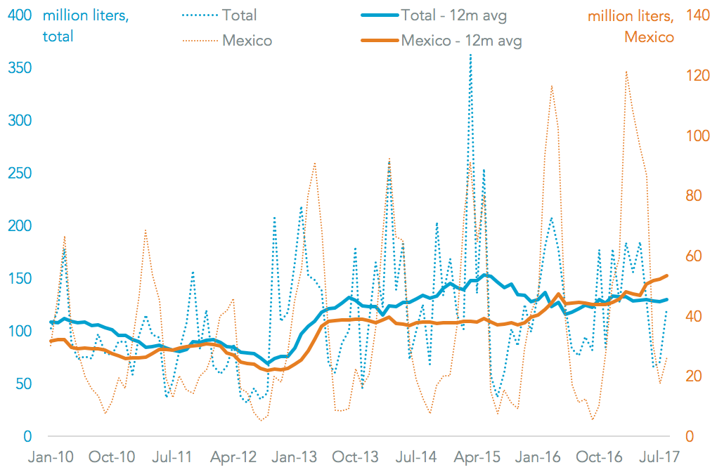 In the case of orange juice itself U.S. demand has declined in the year to date through August 31 by 3.7%. Exports from Mexico have actually increased by 24.1%, at the expense of shipments from Brazil and Costa Rica.